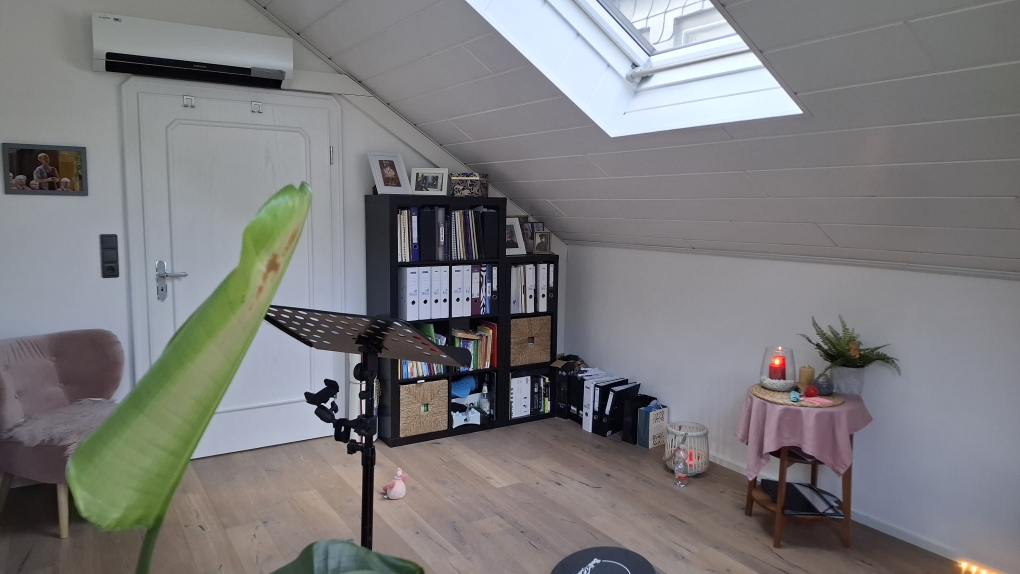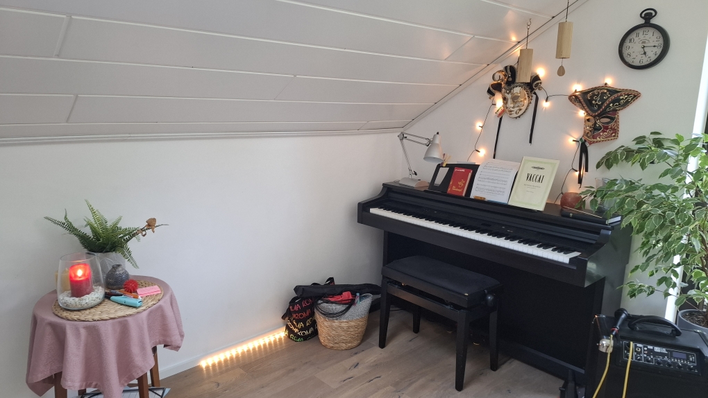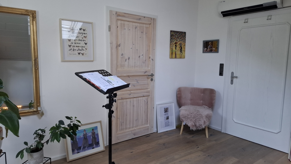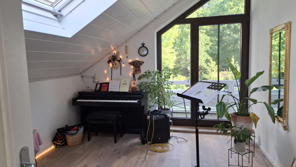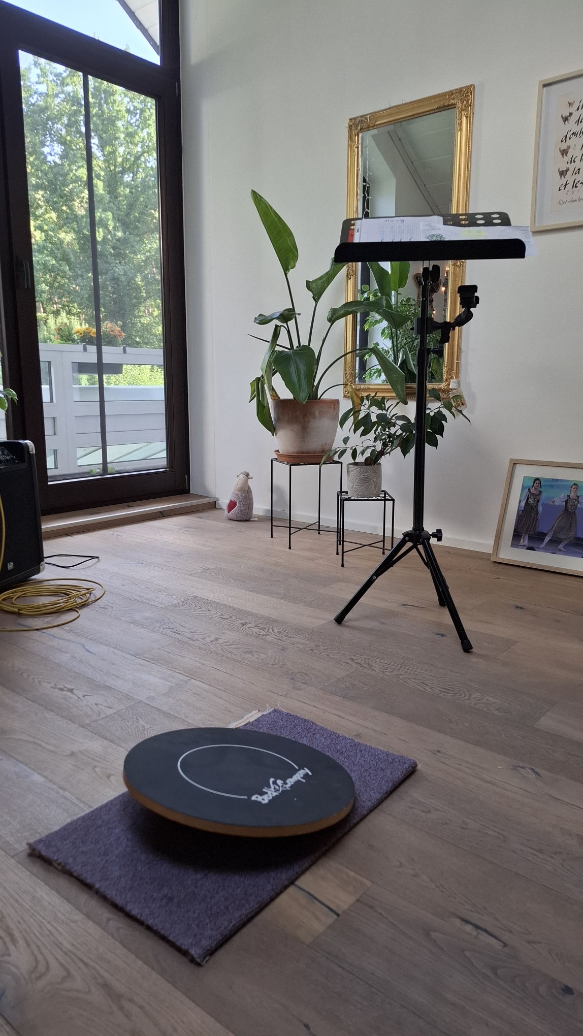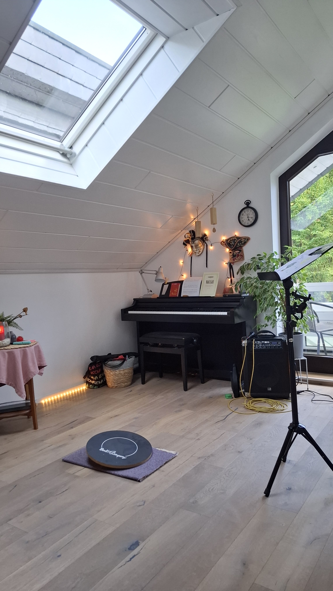 in meinem privaten Musikzimmer mit Klavier, Pezziball und Ballanceboard und weiterem Equipment in gemütlicher Atmosphäre mit einem Tässchen Tee, das die Kehle ölt.