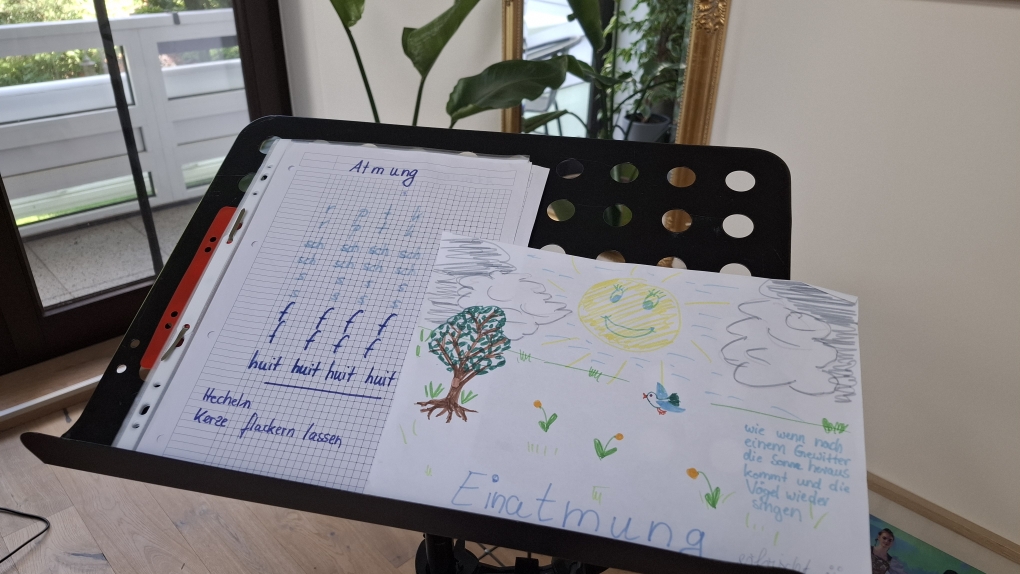 Die Aufwärmübungen machen wir wie gewohnt zusammen, jeder am Bildschirm in seiner eigenen Wohnung. Das geht genau so wie bei mir im Musikraum.